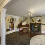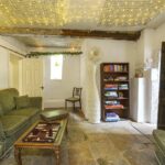 “The adjacent games room has original medieval flagstones and could be used as a gym, or sitting room. The new Grant oil fired boiler is discreetly housed in this room. The neighbouring ground floor bedroom has a high gable with impressive exposed beams, an en suite shower room and double doors onto the garden terrace. It also has its own pedestrian gateway from the lane, providing the potential for use as self-contained accommodation.”