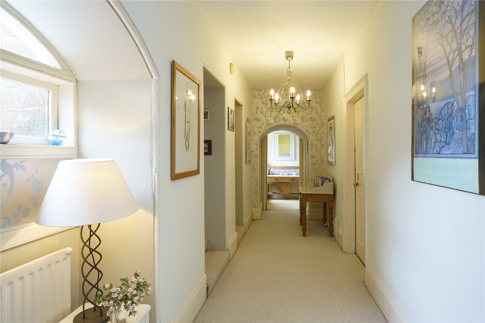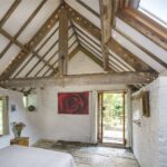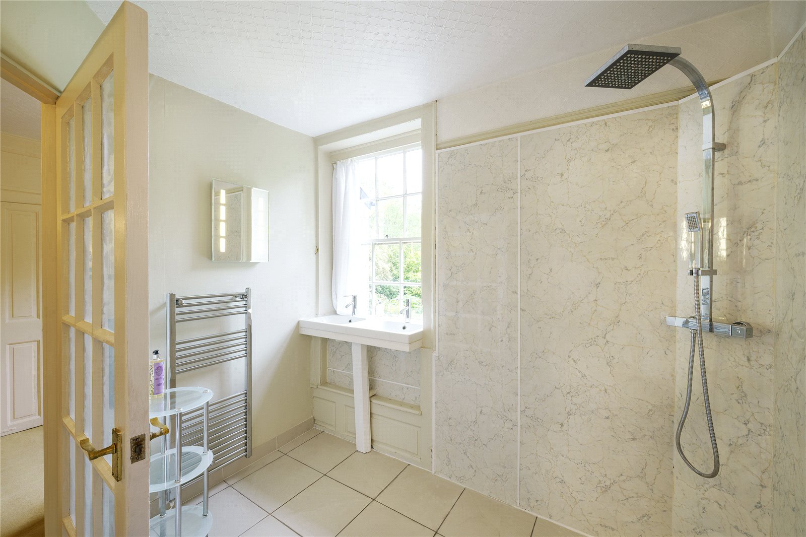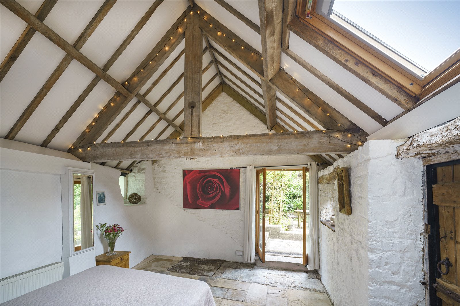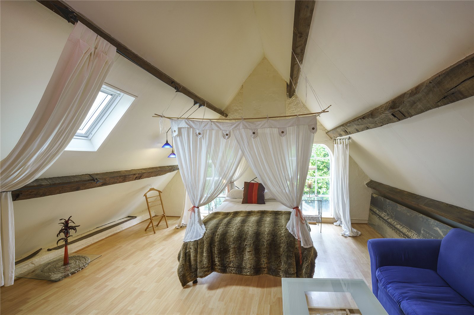 “The top floor offers a suite of rooms, with beams, double aspect windows with a view along the fields of the valley, a corner bath with shower, WC and basin. Like the two garden rooms on the ground floor, these rooms easily adapt to a flat for an au pair or similar. A few centuries ago, they were the servants’ spacious quarters.”