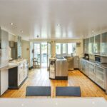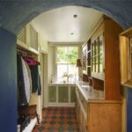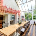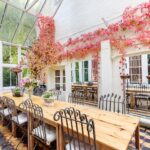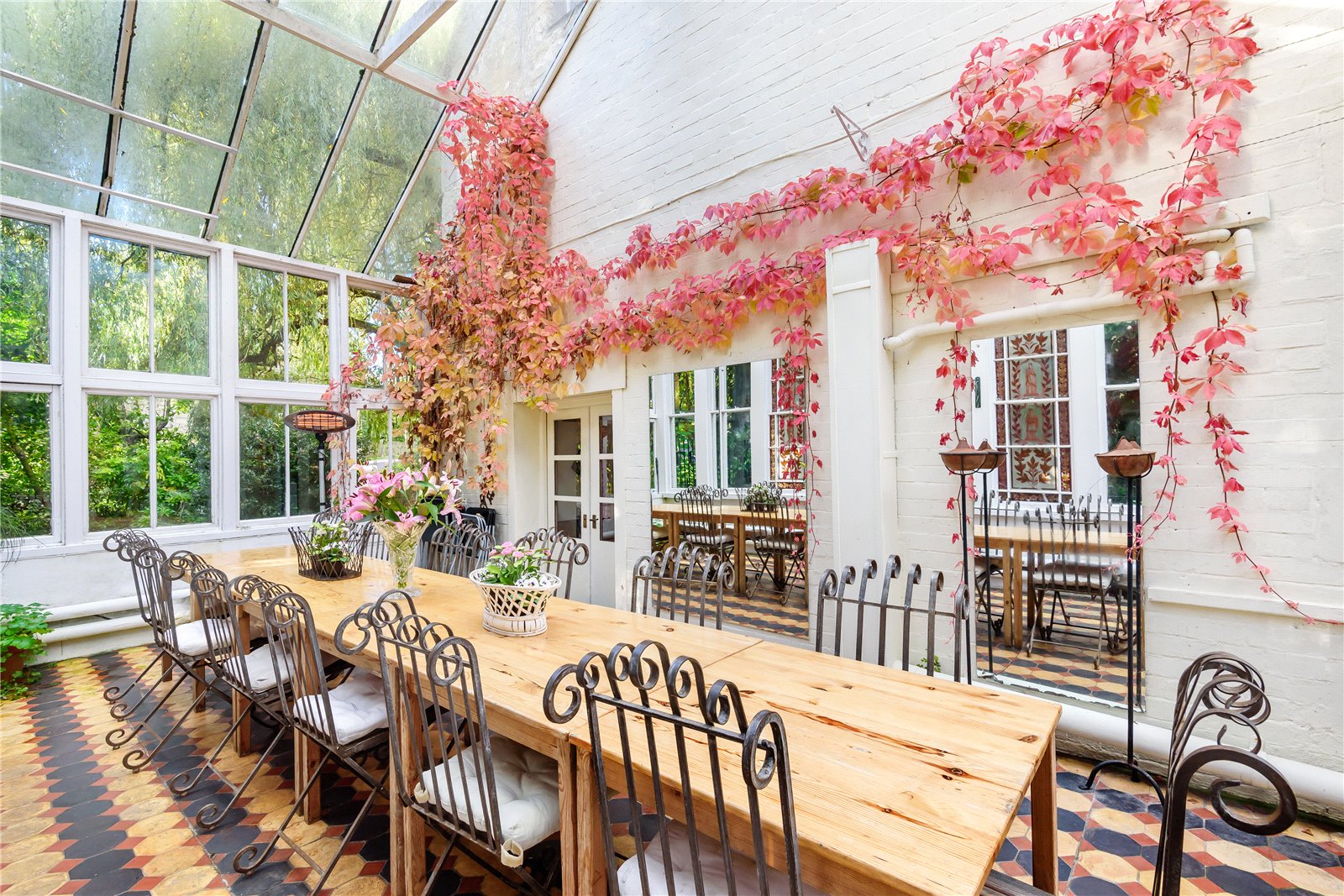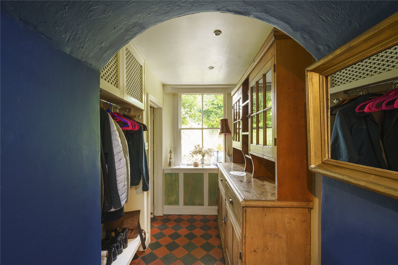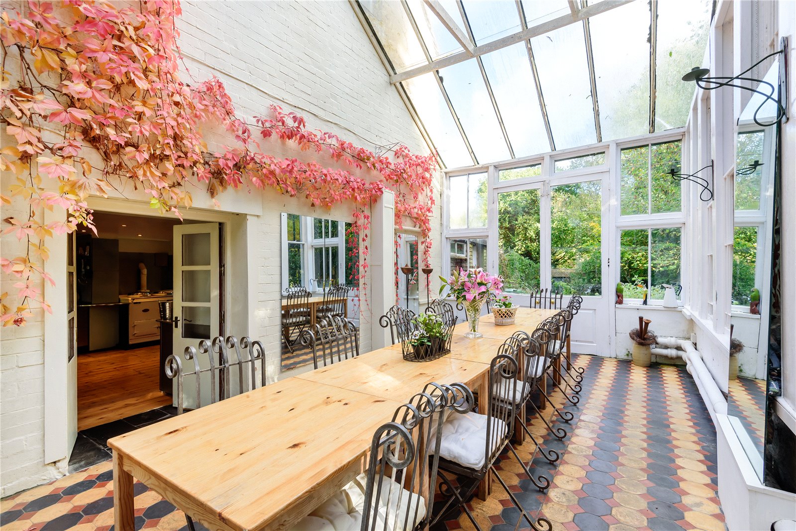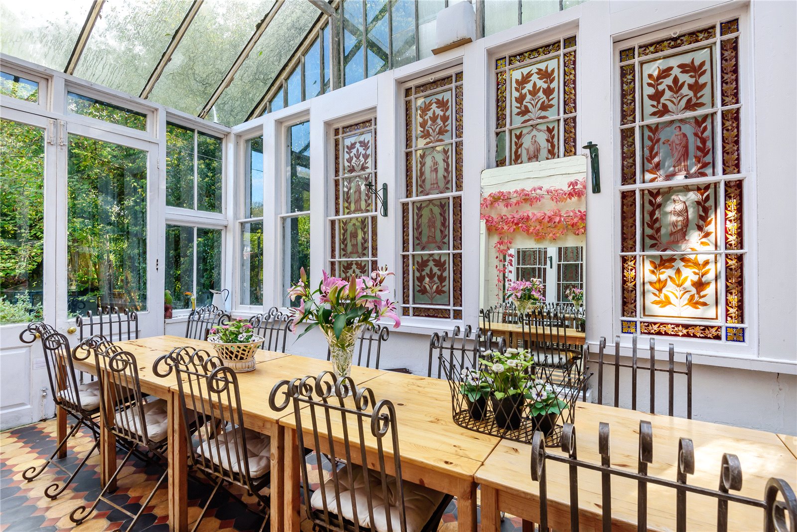 “The spacious kitchen/ breakfast room has stainless steel worktops, oil fired Aga, double electric oven, with five cylinder gas hobs, double steel sink, dishwasher and fridge freezer and space for a table for ten. It has doors to the utility room, with walk-in larder and downstairs shower room. There are double doors to the spacious Victorian conservatory. This summer room has a tessellated floor and four large stained glass windows depicting the four seasons and the four graces. It is a magical place to dine on a summer’s evening when the candlelight is reflected in the glass ceiling. Double doors lead out to the courtyard at the back with the lawn beyond and a single door opens onto the Victorian old red brick courtyard hidden behind a holly tree in the front garden. In the autumn the conservatory reddens with Virginia creeper.”