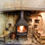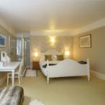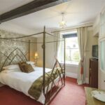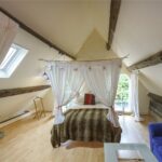 “A 400 year old wide spiralled staircase leads to the next floor. Here you will find a high gabled bedroom with two floor-to-ceiling arched windows, a stone fireplace and five hefty ancient beams. This used to be our snooker room, adjacent to another king sized bedroom. Both bath and shower en suite bathrooms serve these two rooms.”