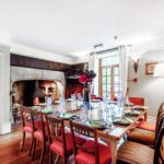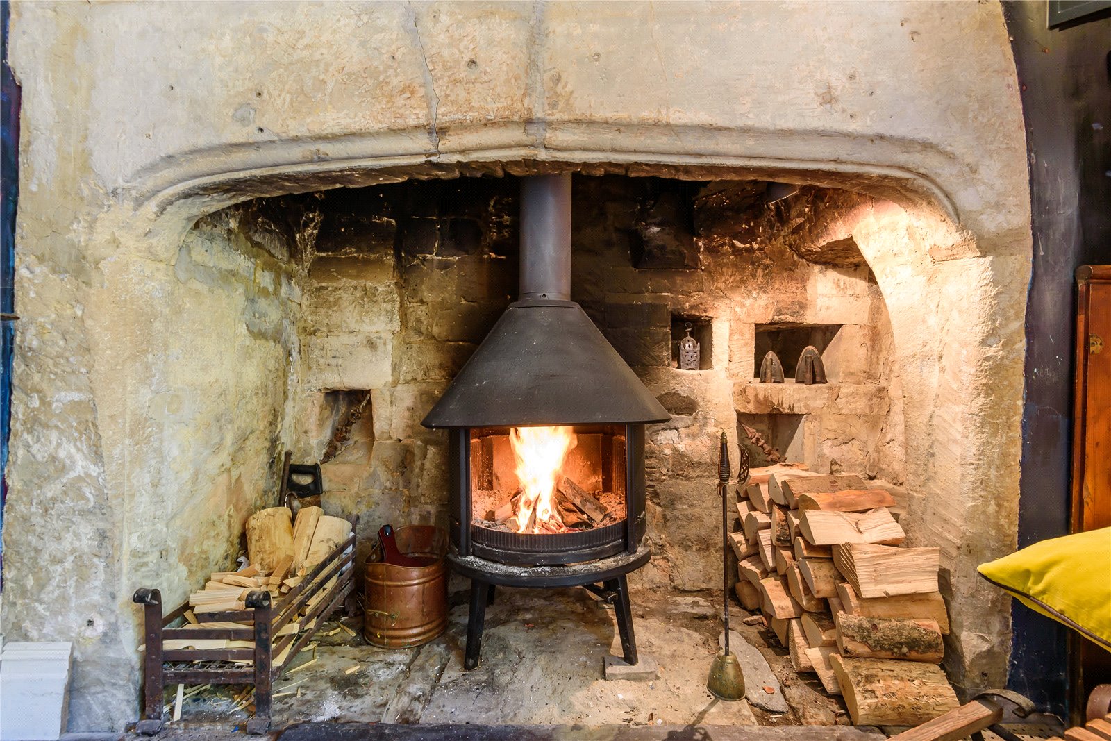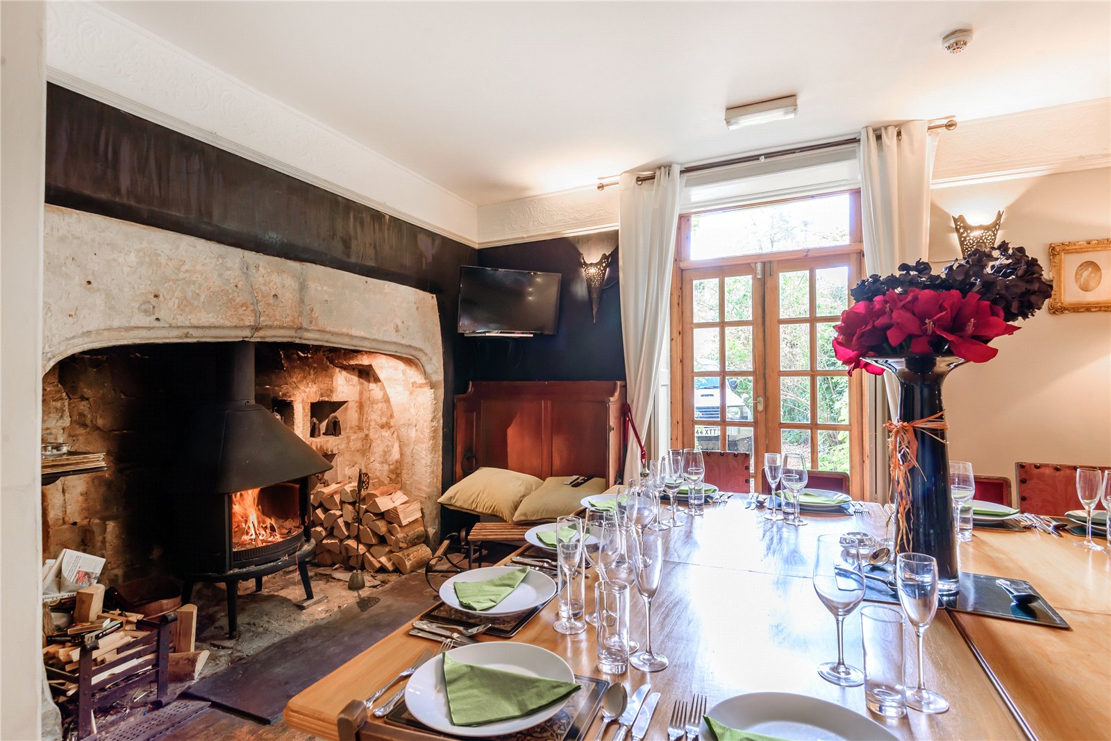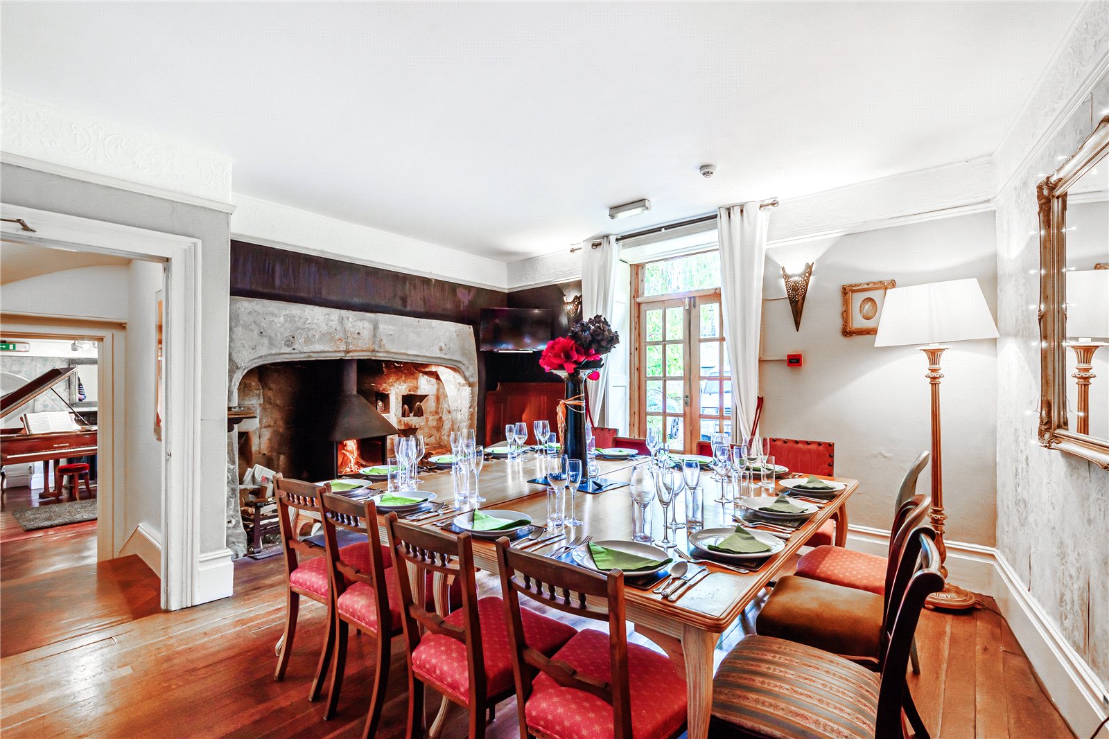“The dining room has a fifteenth century inglenook fireplace with a stone seat for the servant to sit while turning the spit, a bread oven and secondary flue. This is a wonderful room at Christmas – the inglenook fireplace provides a perfect chimney for Father Christmas and his half eaten mince pie, glass of whisky and the Christmas tree. There is a Jotul wood burning stove, oak floor and double doors to the front drive.”