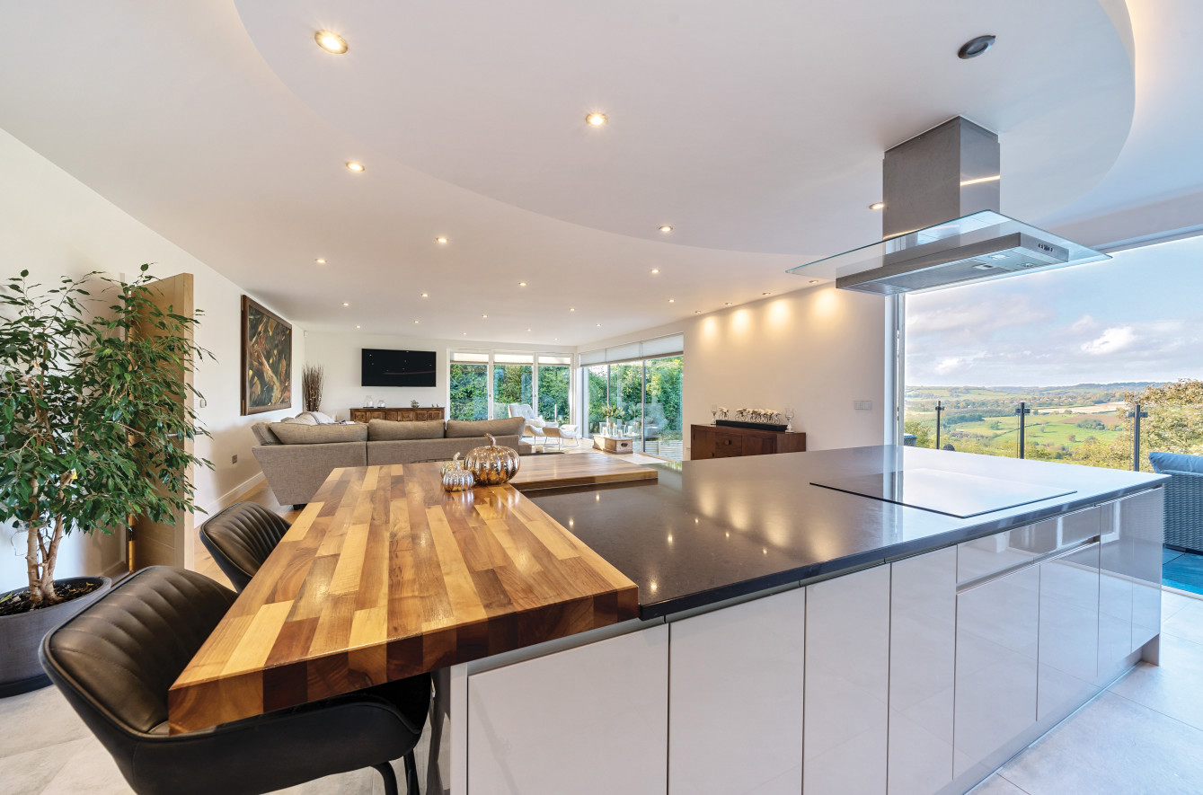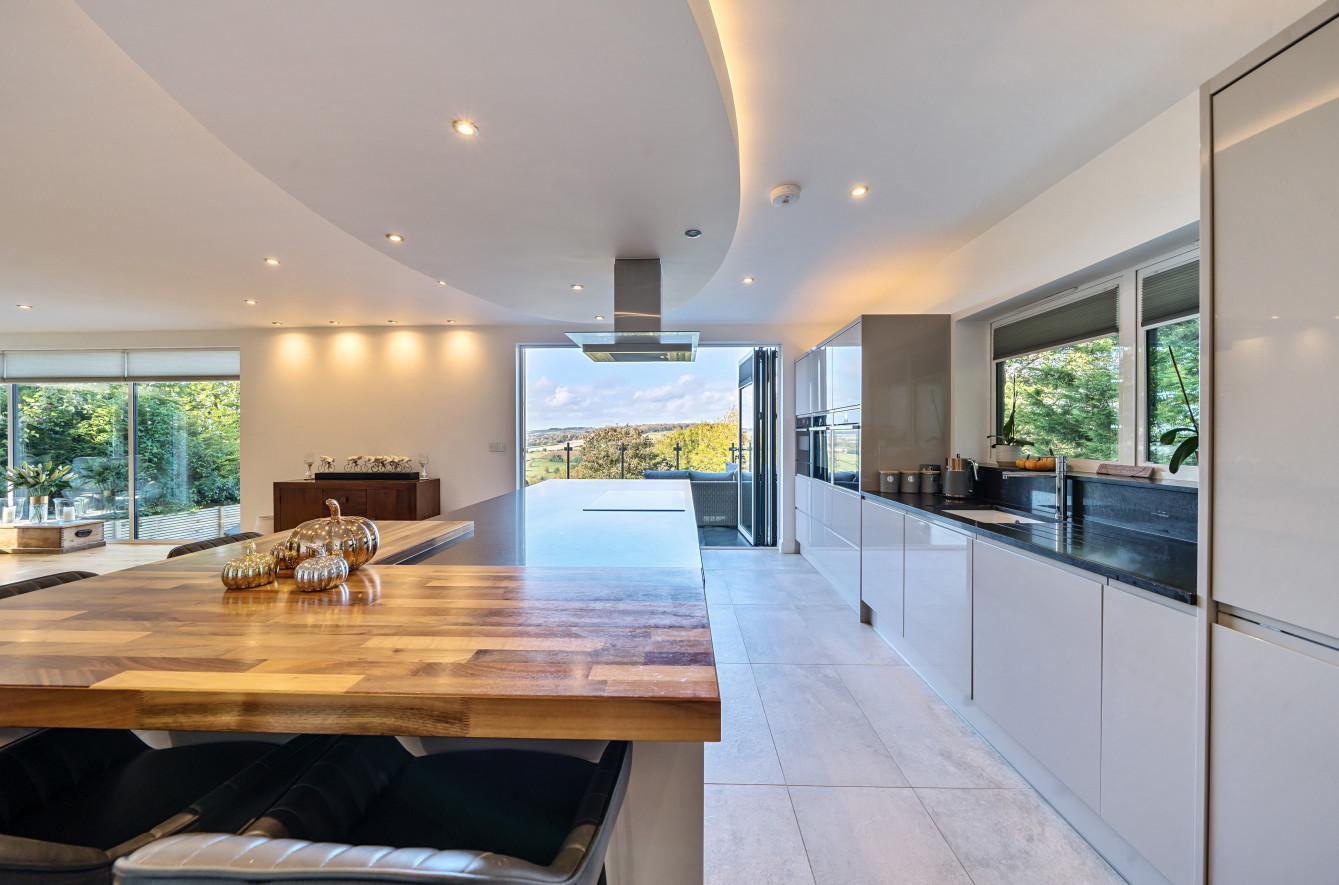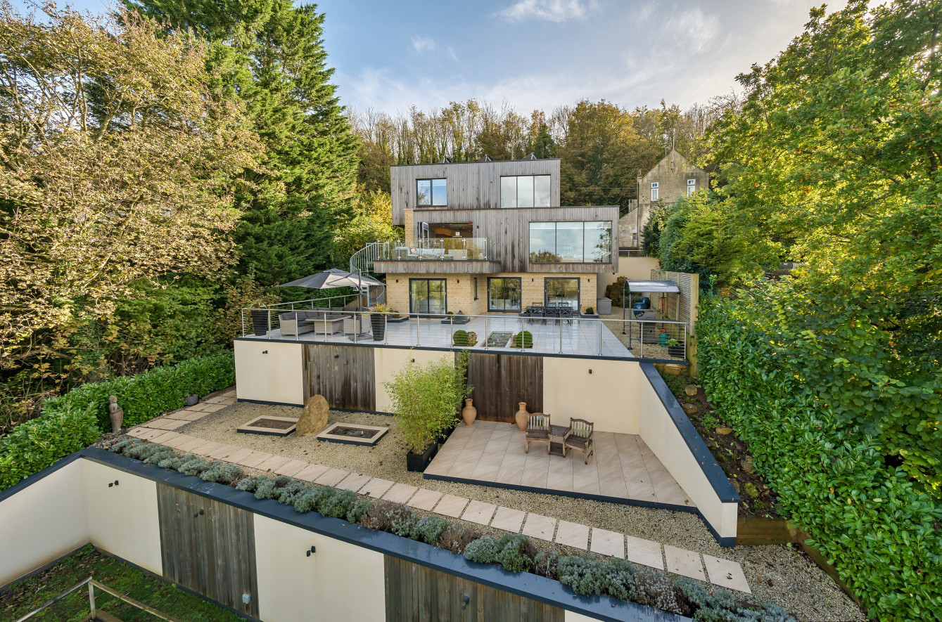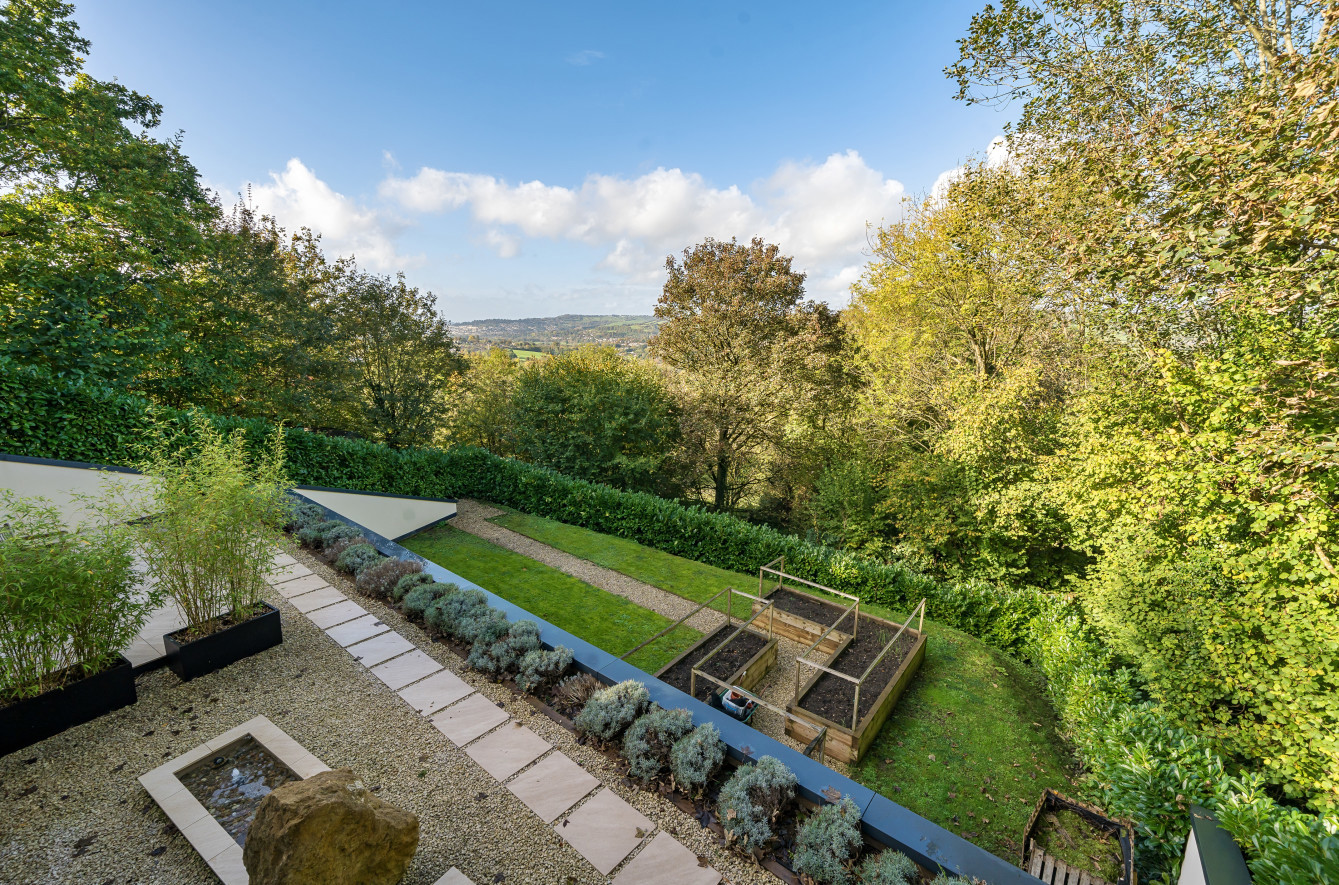 Bespoke built by the current owners, this unique modern detached home with breath-taking valley views is nestled into the hillside on the Kingsdown slopes between Bath and Corsham. Positioned on an elevated site, it spans three pod-like floors and features five bedrooms, four of which are en suite, distributed across the lower and upper levels. The top floor boasts a luxurious suite complete with a jacuzzi bath and a dressing room. Accessible via a private drive that comfortably accommodates four cars, it includes a single garage and is surrounded by contemporary terraced gardens with lawns, water features, and patio areas. 'The house looks directly across the valley and over to Bath on the left – the views were a major attraction for us when choosing the plot,' explain the owners. They further add, 'when we bought the land, our vision was to build a modern home that truly embraced the wonderful surroundings.' Designed for comfort and flooded with natural light, Pen Bryn is an exceptional home where one can enjoy a quiet country life without feeling too isolated. 'The rural village location has provided us with peace and tranquillity while still being close enough to Bath – a city we love – to enjoy its exceptional amenities and attractions, from great restaurants to excellent schools.' Featuring open-plan living areas and bi-fold doors that lead to a stunning balcony overlooking the garden and the valley beyond, the house is wonderfully designed for entertaining. 'This primary living area includes the kitchen and a seating area where everyone comes together – it’s ideal for both winter and summer entertaining.'