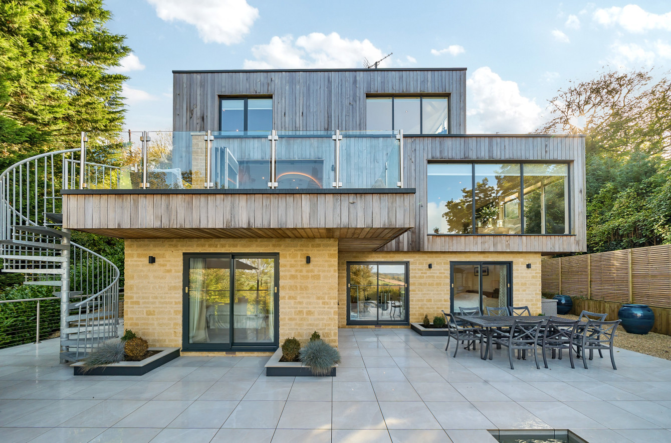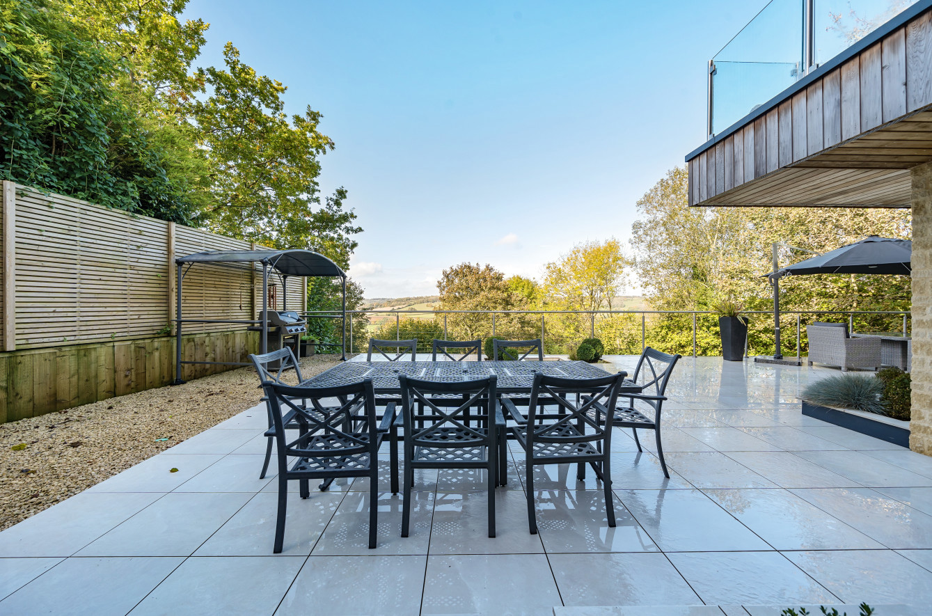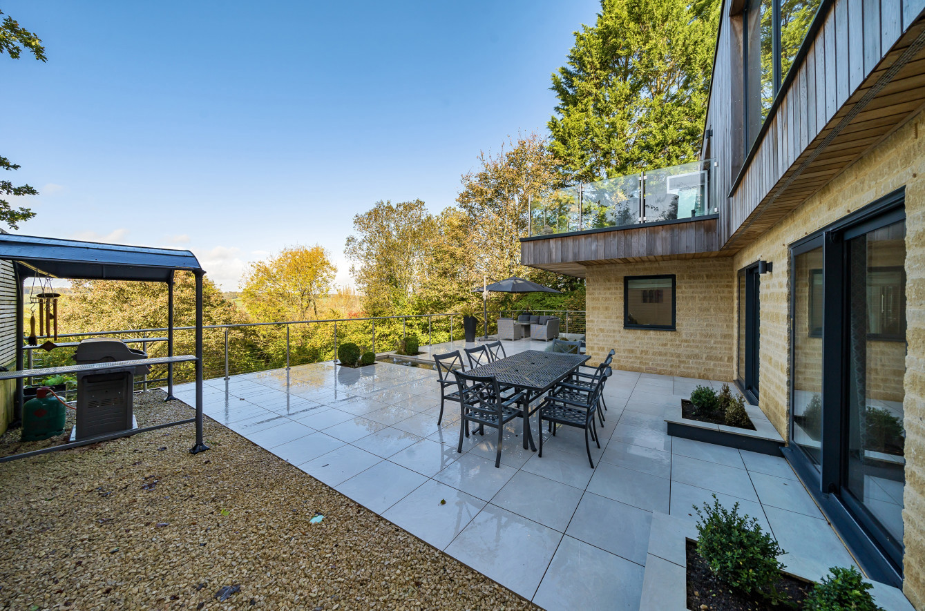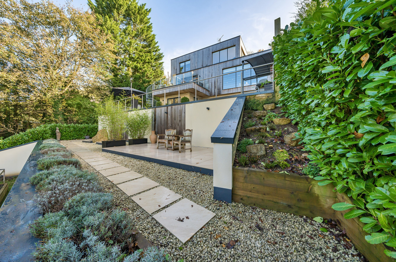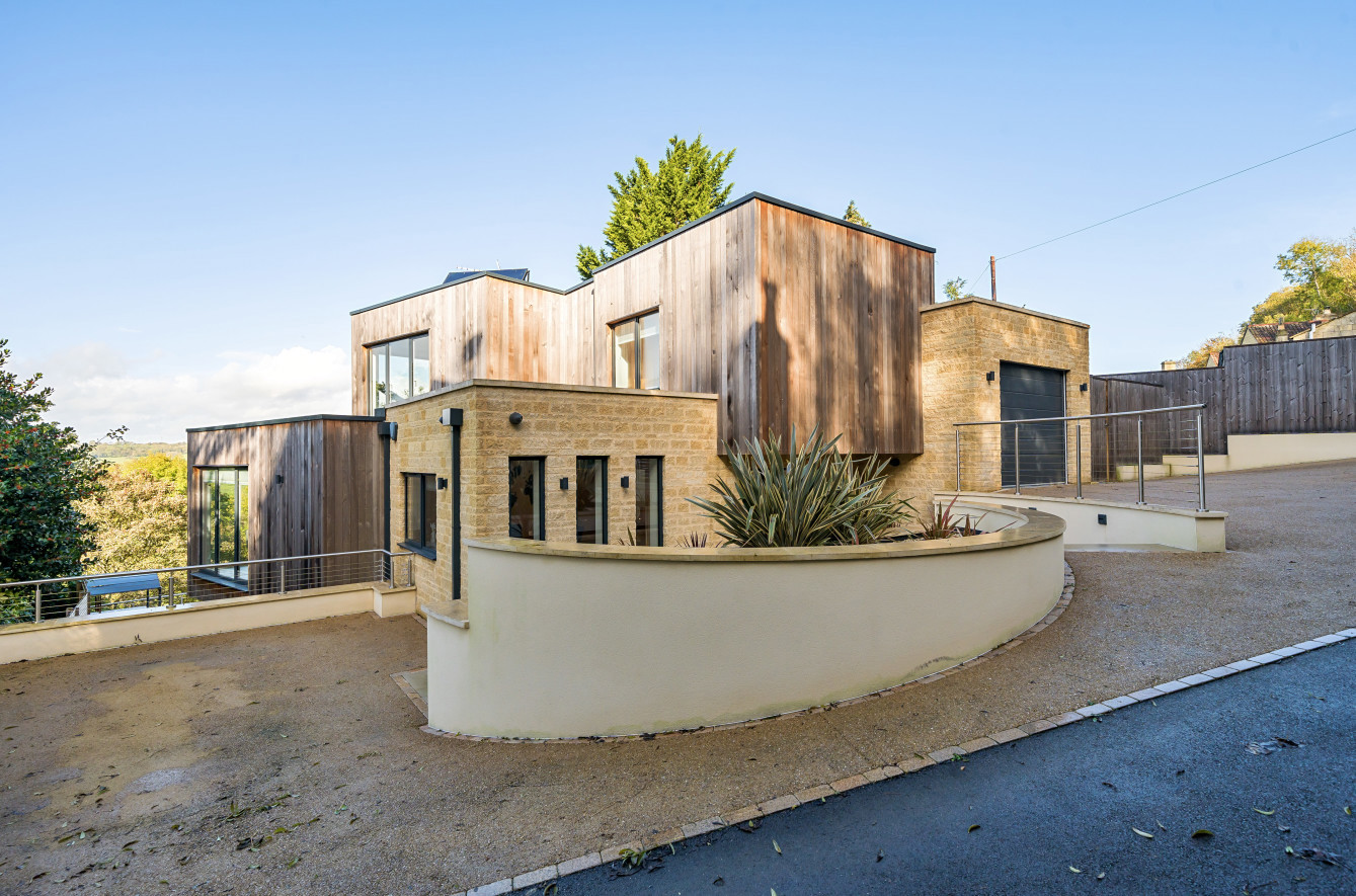 Bespoke built by the current owners, this unique modern detached home with breath-taking valley views is nestled into the hillside on the Kingsdown slopes between Bath and Corsham. Positioned on an elevated site, it spans three pod-like floors and features five bedrooms, four of which are en suite, distributed across the lower and upper levels. The top floor boasts a luxurious suite complete with a jacuzzi bath and a dressing room. Accessible via a private drive that comfortably accommodates four cars, it includes a single garage and is surrounded by contemporary terraced gardens with lawns, water features, and patio areas. 'The house looks directly across the valley and over to Bath on the left – the views were a major attraction for us when choosing the plot,' explain the owners. They further add, 'when we bought the land, our vision was to build a modern home that truly embraced the wonderful surroundings.' Designed for comfort and flooded with natural light, Pen Bryn is an exceptional home where one can enjoy a quiet country life without feeling too isolated. 'The rural village location has provided us with peace and tranquillity while still being close enough to Bath – a city we love – to enjoy its exceptional amenities and attractions, from great restaurants to excellent schools.' Featuring open-plan living areas and bi-fold doors that lead to a stunning balcony overlooking the garden and the valley beyond, the house is wonderfully designed for entertaining. 'This primary living area includes the kitchen and a seating area where everyone comes together – it’s ideal for both winter and summer entertaining.'