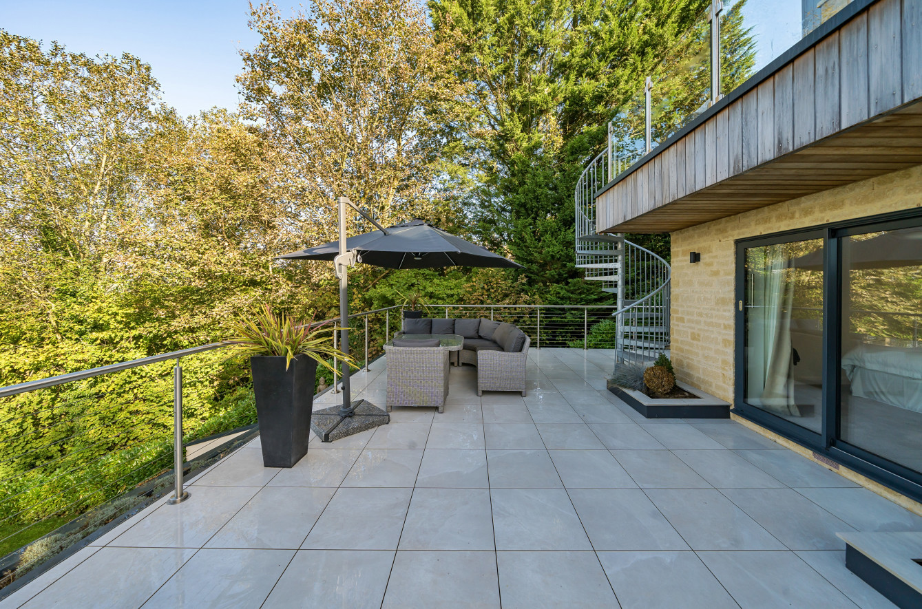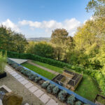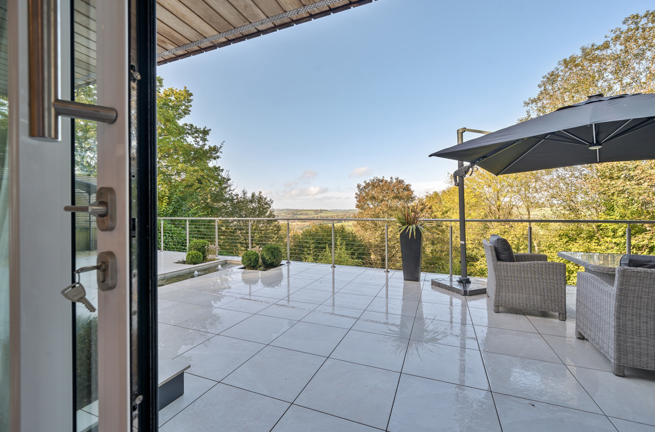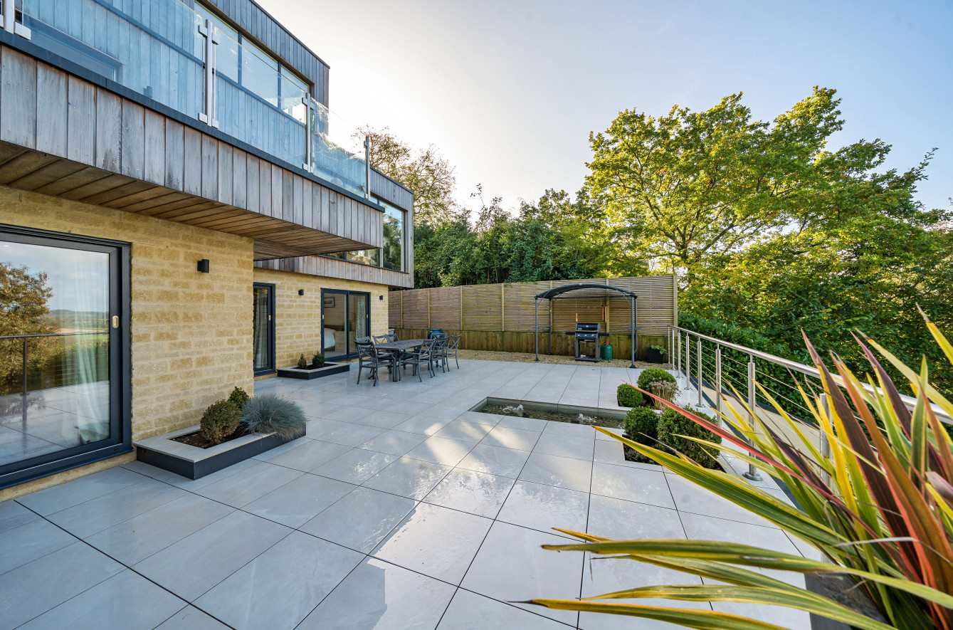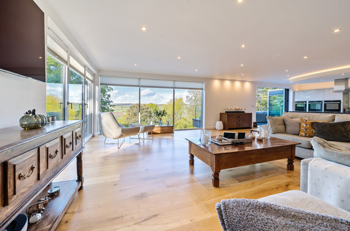 Bespoke built by the current owners, this unique modern detached home with breath-taking valley views is nestled into the hillside on the Kingsdown slopes between Bath and Corsham. Positioned on an elevated site, it spans three pod-like floors and features five bedrooms, four of which are en suite, distributed across the lower and upper levels. The top floor boasts a luxurious suite complete with a jacuzzi bath and a dressing room. Accessible via a private drive that comfortably accommodates four cars, it includes a single garage and is surrounded by contemporary terraced gardens with lawns, water features, and patio areas. 'The house looks directly across the valley and over to Bath on the left – the views were a major attraction for us when choosing the plot,' explain the owners. They further add, 'when we bought the land, our vision was to build a modern home that truly embraced the wonderful surroundings.' Designed for comfort and flooded with natural light, Pen Bryn is an exceptional home where one can enjoy a quiet country life without feeling too isolated. 'The rural village location has provided us with peace and tranquillity while still being close enough to Bath – a city we love – to enjoy its exceptional amenities and attractions, from great restaurants to excellent schools.' Featuring open-plan living areas and bi-fold doors that lead to a stunning balcony overlooking the garden and the valley beyond, the house is wonderfully designed for entertaining. 'This primary living area includes the kitchen and a seating area where everyone comes together – it’s ideal for both winter and summer entertaining.'