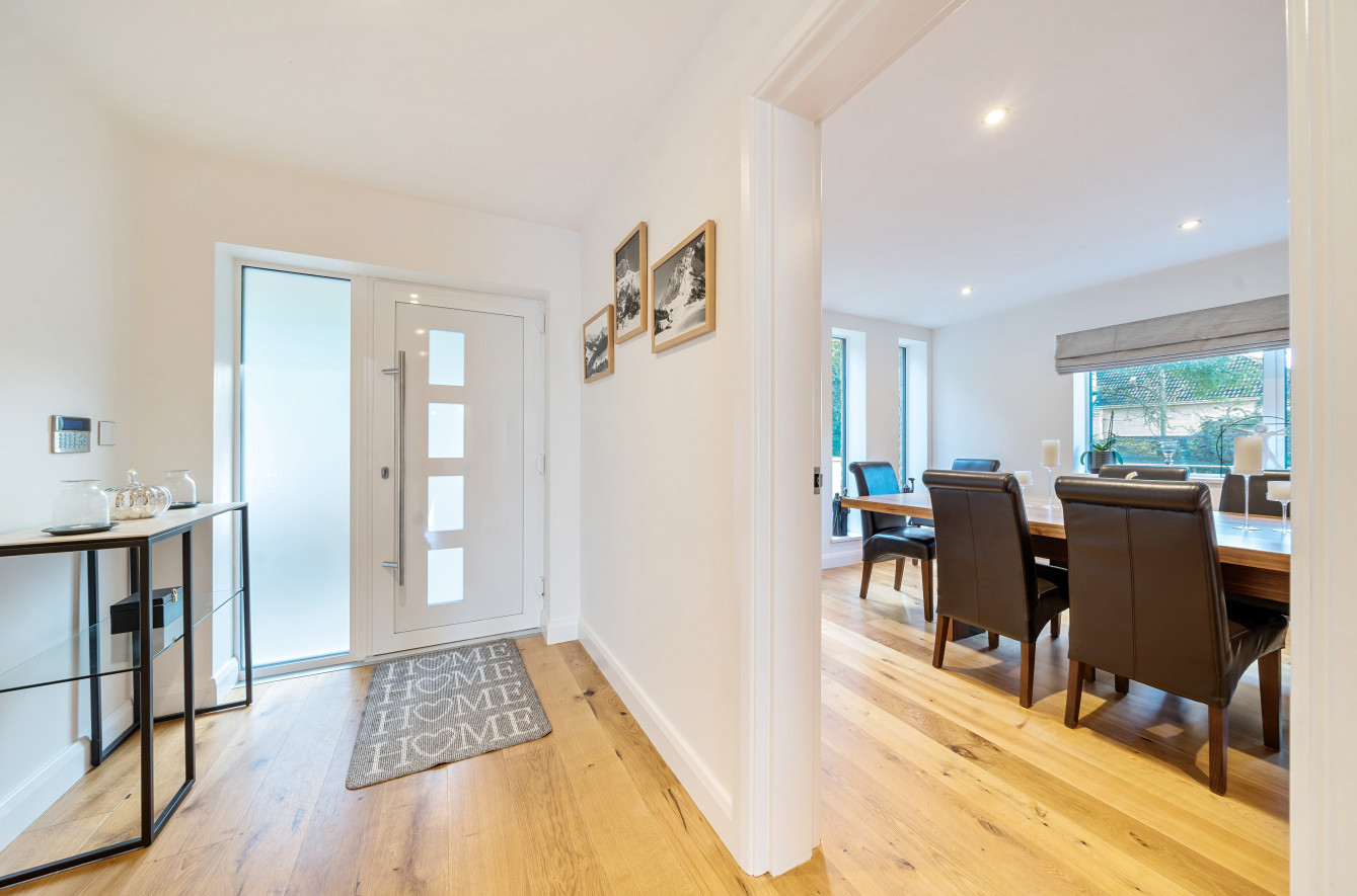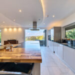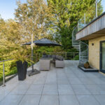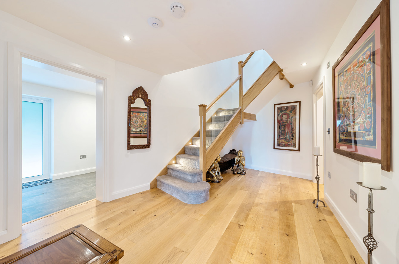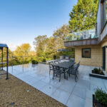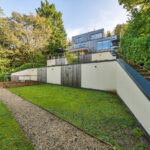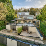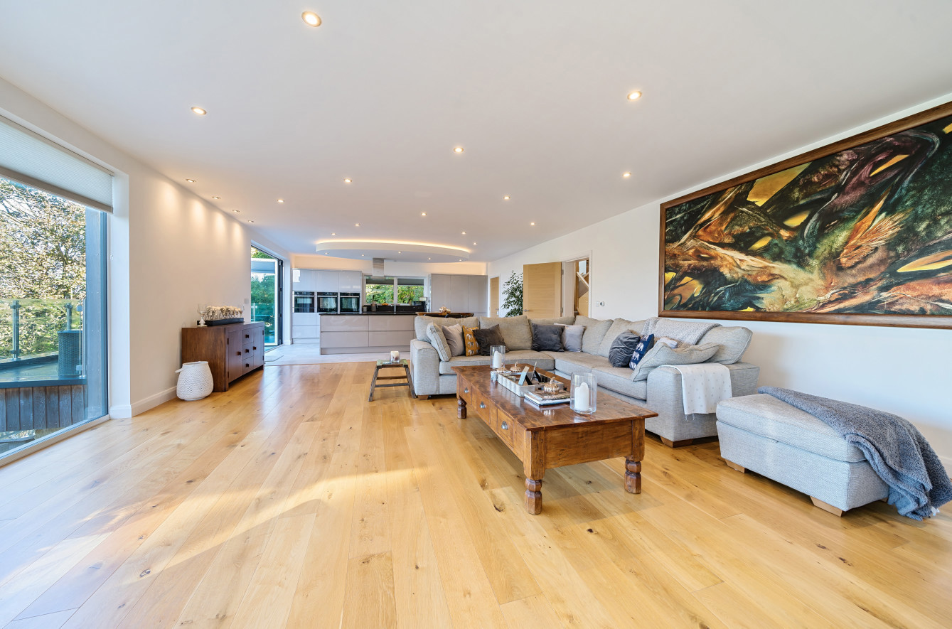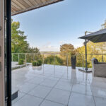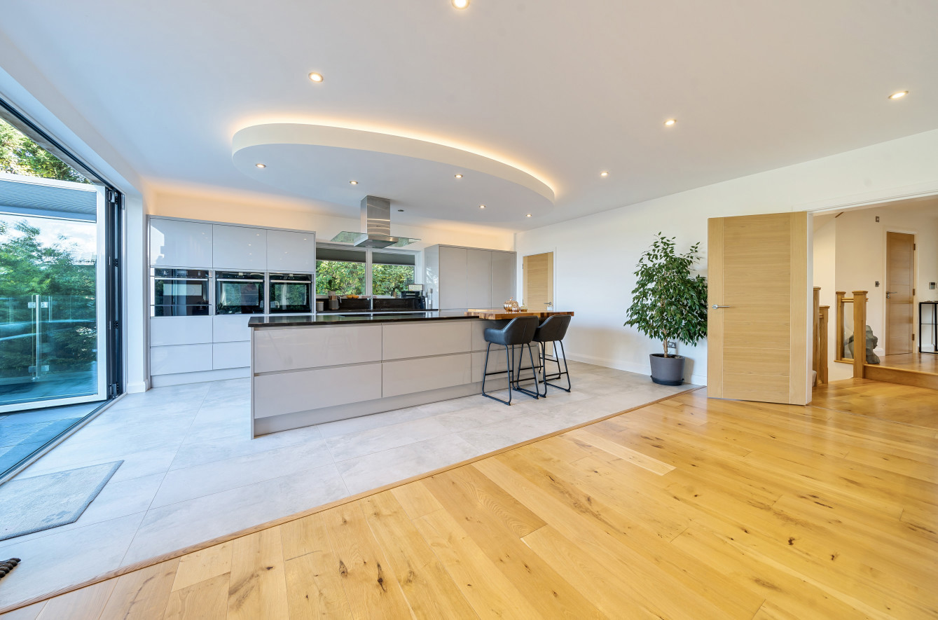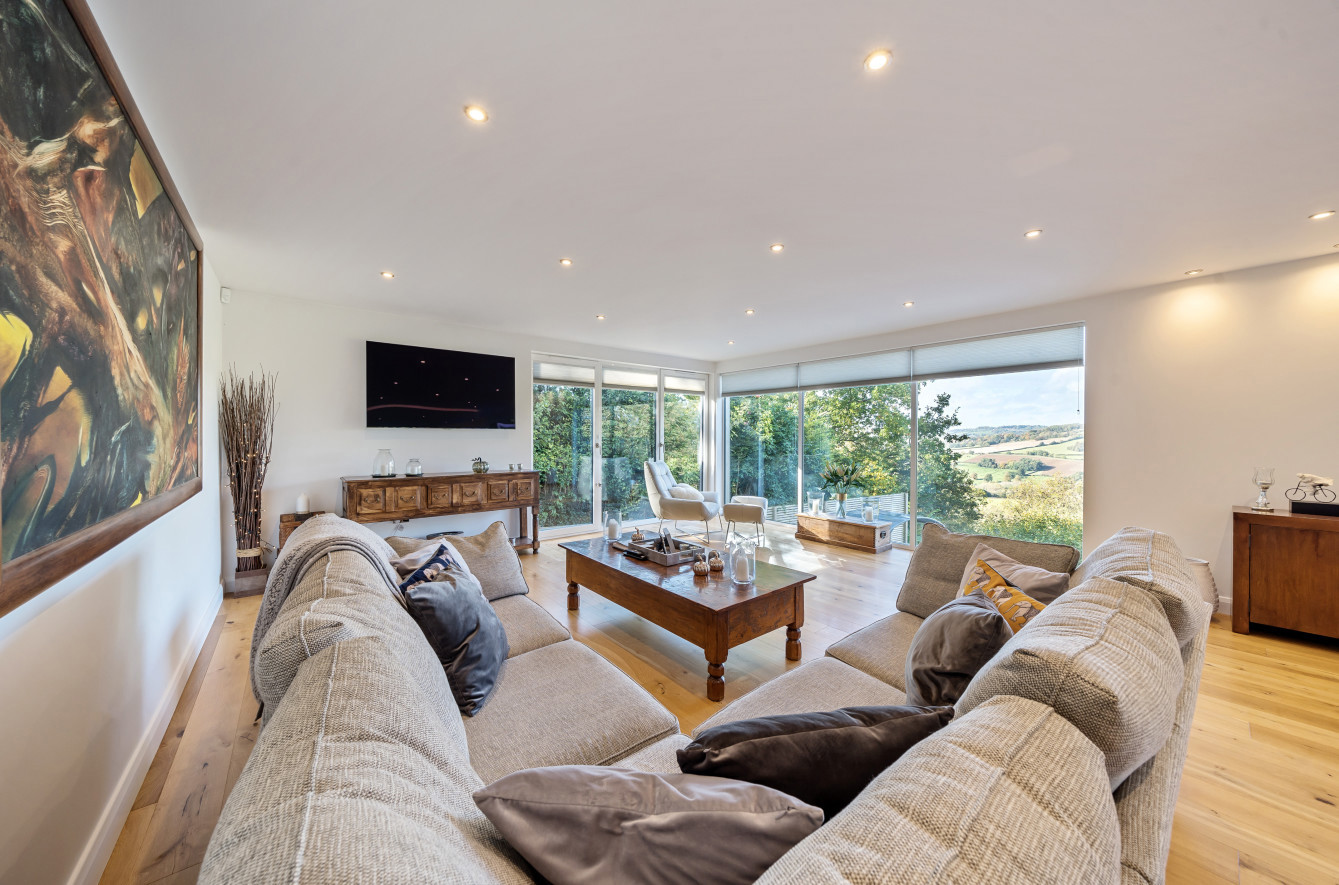 Bespoke built by the current owners, this unique modern detached home with breath-taking valley views is nestled into the hillside on the Kingsdown slopes between Bath and Corsham. Positioned on an elevated site, it spans three pod-like floors and features five bedrooms, four of which are en suite, distributed across the lower and upper levels. The top floor boasts a luxurious suite complete with a jacuzzi bath and a dressing room. Accessible via a private drive that comfortably accommodates four cars, it includes a single garage and is surrounded by contemporary terraced gardens with lawns, water features, and patio areas. 'The house looks directly across the valley and over to Bath on the left – the views were a major attraction for us when choosing the plot,' explain the owners. They further add, 'when we bought the land, our vision was to build a modern home that truly embraced the wonderful surroundings.' Designed for comfort and flooded with natural light, Pen Bryn is an exceptional home where one can enjoy a quiet country life without feeling too isolated. 'The rural village location has provided us with peace and tranquillity while still being close enough to Bath – a city we love – to enjoy its exceptional amenities and attractions, from great restaurants to excellent schools.' Featuring open-plan living areas and bi-fold doors that lead to a stunning balcony overlooking the garden and the valley beyond, the house is wonderfully designed for entertaining. 'This primary living area includes the kitchen and a seating area where everyone comes together – it’s ideal for both winter and summer entertaining.'